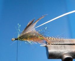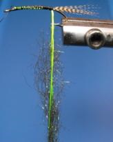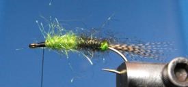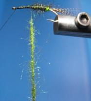 Corps : Partie arrière ice dubbing olive brown, partie avant boucle avec fil de montage et ice dubbing caddis green