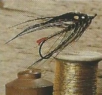 Corps: En deux parties égales; Tinsel doré plat, cerclé de tinsel doré ovale; Dubbing de fourrure de phoque noir, cerclé de tinsel argent plat.