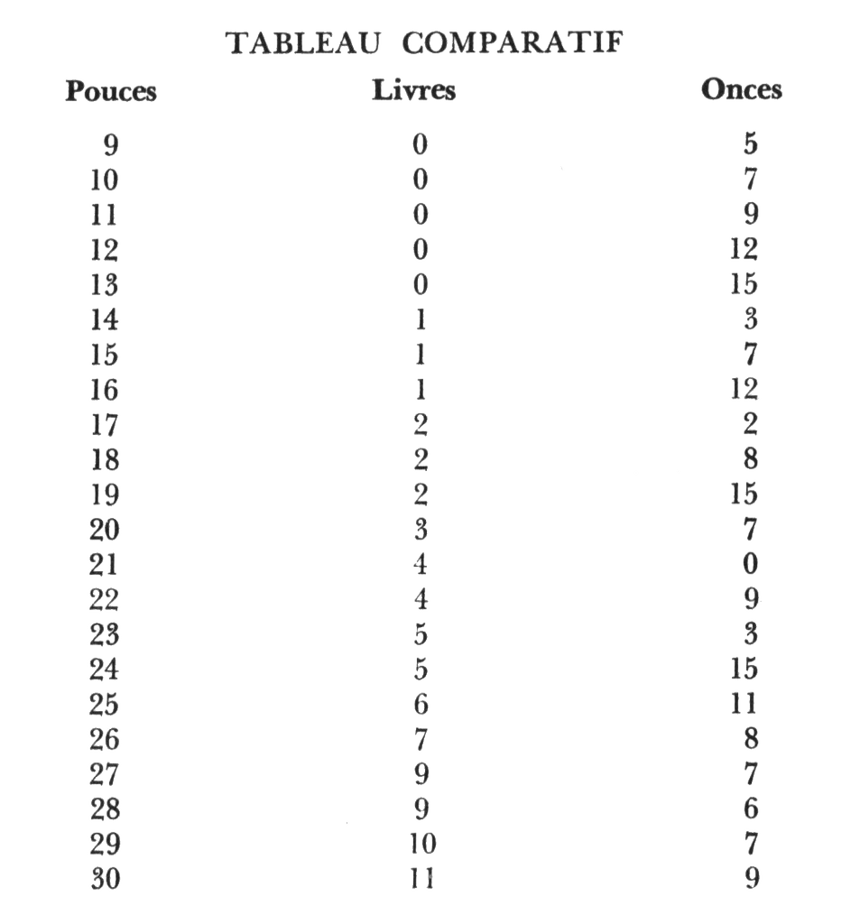 C'est le cas de truites « ballonnées » — avec un gros ventre. Ces truites prennent de l'importance en circonférence ! Je me souviens d'une truite grise qui était si oblongiforme qu'elle ressemblait à une carpe ! Elle mesurait 27 pouces mais pesait 12 livres ! Si cette truite avait consommé un corégone de 3 livres avant de se faire prendre... ça expliquerait bien des choses. Dans les concours, certains pêcheurs trichent et font avaler à leurs brochets quelques gros plombs de pêche à la traîne... pour gagner quelques onces ! Nous ne parlerons pas de ces cas qui n'ont rien à voir avec la réalité. Ce qui importe, c'est que vous pouvez vous fier à ce tableau.