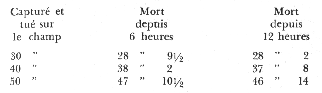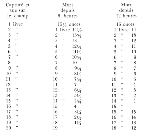 Je vous ai donné une table des relations longueur-poids pour la truite. Je vous ai également signalé le fait que les poissons perdaient du poids après leur sortie de l'eau et continuaient à en perdre pendant plusieurs heures, non seulement dans la chaloupe, mais une fois arrivé au chalet, et à plus forte raison, une fois chez vous en ville. Certains pêcheurs ne verront aucun intérêt dans ce qui va suivre, mais ceux que la question du poids exact d'un poisson au moment de sa capture intéresse seront sans doute ravis de prendre connaissance du tableau suivant :