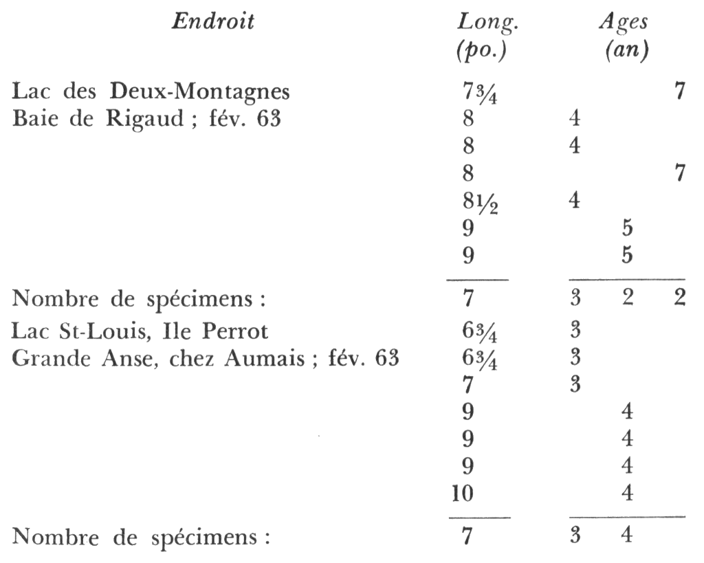 En jetant un coup d'oeil sur ce tableau, on constate qu'une perchaude de 9 pouces qui habite la baie de Rigaud est âgée de 5 ans. Une perchaude de même taille habitant la Grande Anse n'a que 4 ans. Donc, les perchaudes du lac St-Louis grandissent plus vite que celles du lac des Deux-Montagnes ! Les parasites externes, comme le nématode, y sont-ils pour quelque chose ? Les eaux de la Grande Anse sont-elles PLUS ou MOINS polluées que celles de la baie de Rigaud ? Existe-t-il un rapport entre la pollution des eaux, les parasites et la taille et l'âge des perchaudes ? L'étude de Courtemanche n'en dit rien pour le moment. Mais nous aurons de toutes ces questions une meilleure idée dès que ce vaste programme d'études sera plus avancé. Réjouissez-vous, pêcheurs des eaux métropolitaines, car vous venez de prendre connaissance des premiers travaux jamais entrepris dans ce domaine dans notre région !