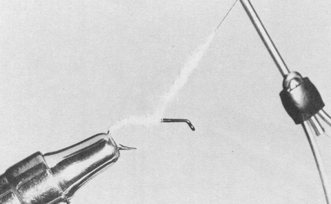 7.- Poissez le fil de montage sur environ 2 cm et garnissez-le de fourrure telle que préparée en 4. À partir de cet élément, confectionnez, en spires serrées, le thorax. Arrêtez à 2 mm de l'oeillet et rendez stable par une demi-clef.