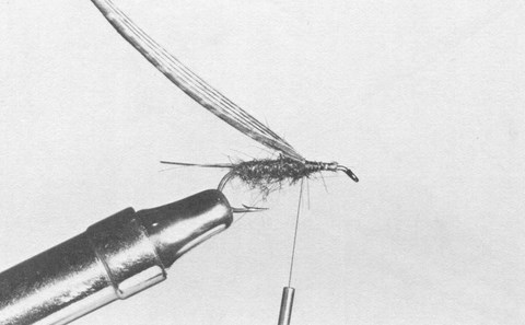 3.- Fixez solidement de chaque côté de la touffe les barbes dénudées. Revenez légèrement vers la gauche en effectuant quelques tours de fil de montage. En pressant ainsi les barbes contre ce pompon de poils, celles-ci s'écartèleront formant les cerques de la nymphe.