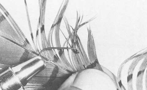 1.- Ancrez le fil de montage à environ 1 cm de l'oeillet et recouvrez la hampe jusqu'à la naissance de la courbure. Prélevez trois barbes d'une plume de queue de faisan.