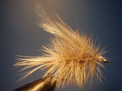 Corps: 2 hackles de selle gris pâle dun, attachés par la pointe et enroulés ensemble sur la hampe.