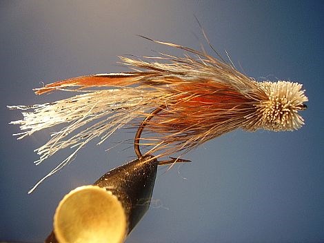Tête: Une seule bonne pincée de poil de chevreuil qui sera laissée pleine longueur pour la collerette et taillée style Muddler pour la tête.