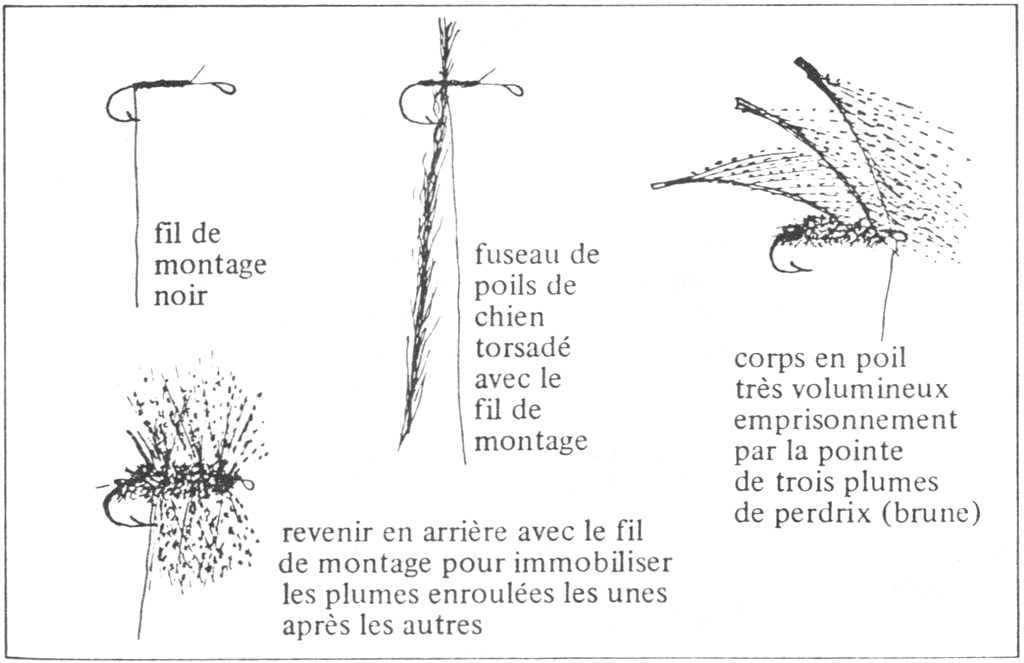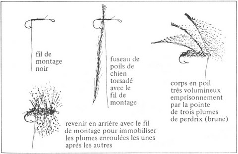 C'est une mouche de mai au corps velu, ce qui est anormal, aux cerques trop nombreux, à la collerette assez opaque, mais qui pourtant, en tant que spent, grâce à la mollesse de ses hackles est très prenante. Je ne sais si c'est la perdrix qui lui confère sa réussite, le canard ou bien son corps en poils ; seules les truites, ses victimes pourraient nous le dire. Personnellement, je ne la trouve pas tellement supérieure aux modèles classiques imitant des imagos mais elle est plus réaliste comme spent, ses hackles s'étalant très bien sur l'eau. Comme la « Merglet » elle est aussi fragile et résiste mal aux dents des truites. Enfin vous pouvez l'essayer, sa confection simple ne demande que quelques minutes.