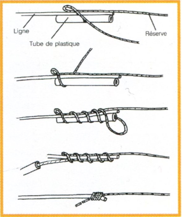 • Embobiner la ligne de réserve, à laquelle sera attachée le ligne proprement dite au moyen du « Nail Knot » (nœud du clou). Le clou est remplacé par un tube de plastique.