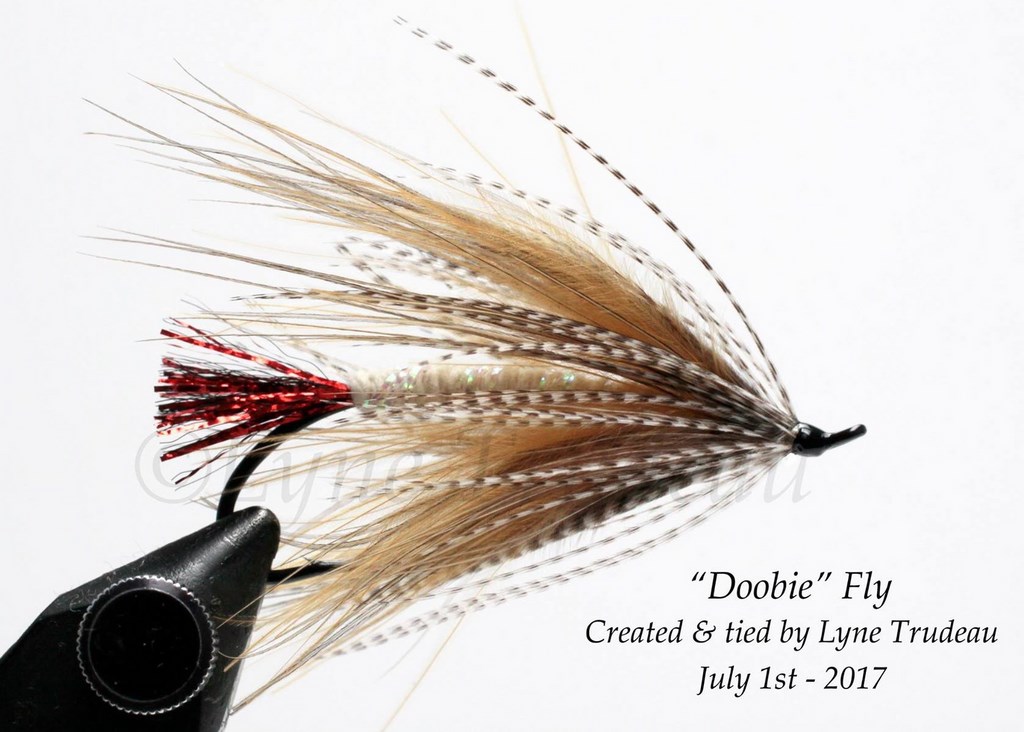 DESCRIPTION : La Doobie : Cette mouche voie le jour sur la rivière Grand-Cascapedia, elle a été créée par Lyne Trudeau spécialement pour Kevin Conway, pour accompagner la chanson qu'il a composé « OH CANNABIS »