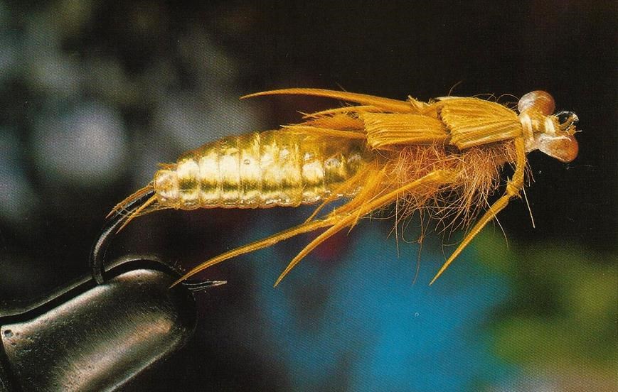 Les matériaux que nous utiliserons pour fabriquer cette artificielle "réalistique" sont les suivants: un hameçon: Mustad #38941 ou 36890, No 6; du fil: 6/0, vert olive; pour la queue: fibres secondaires de plume d'oie, couleur olive; l'abdomen: de la soie floche olive recouverte de "Swannundaze" olive; pour les pattes: des fibres secondaires de plume d'oie, couleur olive; pour le thorax: dubbing de fourrure de phoque, couleur ambre mélangée avec du olive; l'élytre: 2 sections de fibres primaires de plume d'oie, couleur olive; pour fabriqué les yeux: brin de monofilament de 30 lb de résistance.
