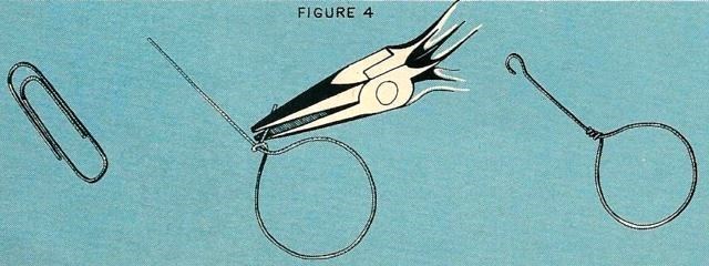 Le lecteur pourra se servir des illustrations de la figure 3 comme modèles, en les calquant et en les transférant sur la tôle pour la taille des pinces à la grandeur et à la forme voulue. Ces illustrations vous renseignent aussi sur la grosseur d'hameçon à employer, de même que sur les coloris des autres matériaux.