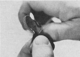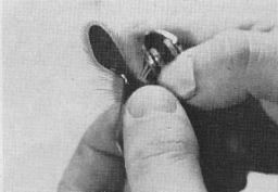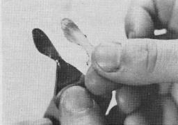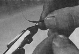 Nous en sommes maintenant à l'étape cruciale de la fabrication des ailes; c'est Ici que vous vous servirez de la pince de .fabrication domestique. Choisissez deux plumes de flanc, de coloris semblable et de courbure opposée, et insérez-en une à l'intérieur de votre pince.