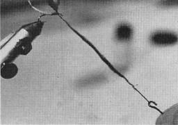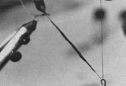 Le corps de la mouche, muni de ses deux cerques de queue, est maintenant prêt à être attaché à l'hameçon. Procédez d'abord à un enroulage de base de fil sur la hampe, ce qui assurera une attache solide et empêchera le corps de glisser autour de la tige métallique. Veillez à ce que le corps repose de façon bien perpendiculaire sur l'hameçon.