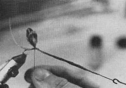 Le fil a été replié sur lui-même et repassé à plusieurs reprises autour de l'hameçon, puis ligaturé à la tête avec un noeud demi-clef. Vous aurez ainsi produit une boucle de fil qui emprisonne le cordon de duvet.