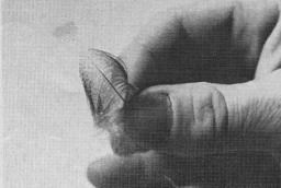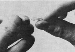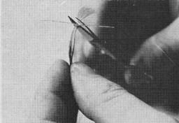 Choisissez une plume de flanc de canard, faisan ou perdrix et, en tenant la pointe de la plume entre le pouce et l'index de la main gauche, redressez les fibres vers l'avant en les passant doucement à rebrousse-poil entre les doigts de la main droite. Veillez à conserver la bonne longueur de fibres de pointes intactes pour la queue, en vous référant aux silhouettes de la figure 3.