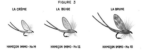 Quelques monteurs pointilleux se livrent à un véritable travail d'orfèvre pour essayer d'obtenir une mouche conforme dans les moindres détails à l'originale, d'autres objectent que cette minutie est inutile du point de vue du poisson et préfèrent les modèles purement attractifs. Après avoir, pendant un temps, adopté moi-même les deux attitudes, j'en suis finalement arrivé à la conclusion qu'il est possible d'en marier les doubles avantages dans une mouche sèche à l'apparence très naturelle, mais qui reste quand même de fabrication facile et assez solide pour ne pas craindre d'affronter la gueule des poissons.