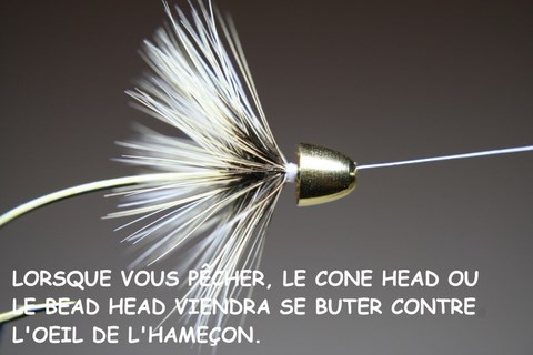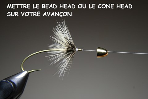 Et voici un troisième truc qui je pense plaira à bien des monteurs. C'est la plus facile, la plus rapide, la plus polyvalente et la plus économique pour l'utilisation des bead head eu des cone head. Il s'agit d'enfiler la bille ou le cône de notre choix sur notre avançon.