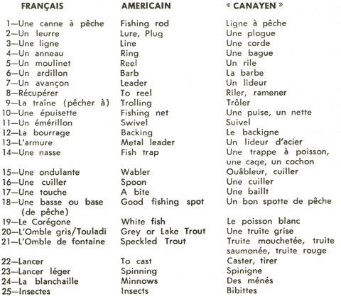 Dans le monde de la pêche sportive (de chasse nous parlerons cet automne), c'est pire qu'ailleurs car il est pratiquement impossible d'entendre plus de 3 phrases décrivant telle ou telle technique de pêche ou de lancer sans qu'apparaisse, sonore et triomphant, le cortège d'anglicismes, de barbarismes et de «jouai». J'admets qu'un sportif, quel qu'il soit, puisse se permettre certaines libertés de langage, y compris un certain « jargon de métier » que l'auguste Académie française n'a pas encore eu le temps d'inscrire au dictionnaire encyclopédique ou autre . . . Cependant, ce n'est pas une raison pour demander à un voisin de pêche : « Y te reste-t-y des leaders pis des plogs comme on avait à matin ? »
