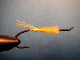 Attachez une pincée de fibres d’une plume de selle de couleur orange fluorescent sous la hampe en forme de jabot. Une fois attachées, tirez un peu sur les fibres vers l’avant. On devrait entrevoir le corps entre le bout des fibres (peu denses).