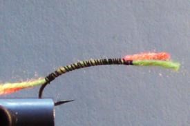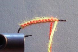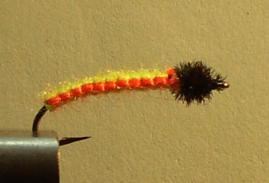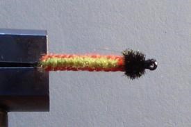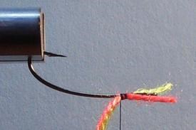 NOTE : Alors que je m'exerçais à réaliser différents tissages pour former le corps de mouches, j'ai improvisé celle-ci qui m'inspire confiance. Je dois vous avouer que je ne l'ai pas mise à l'épreuve et il est rare que je propose de tels montages sans les avoir essayés. La petite ligne latérale rouge et le jaune me rappellent les couleurs de la Mickey Finn bien que la ressemblance s'arrête là.