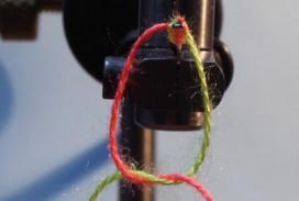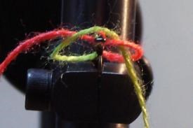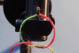 #6 + #7) Placer ensuite la laine jaune sur la hampe et la rouge sous celle-ci. Tirer de chaque côté.