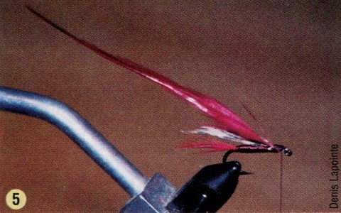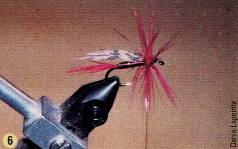 Pour terminer, maintenir le hackle enroulé entre les doigts de la main gauche et le retenir un peu vers l'arrière. Faire quelques tours avec le fil d'attache pour maintenir le hackle dans un certain angle, vers l'arrière, et fixer le tout solidement. Refaire quelques tours serrés pour compléter la tête, couper et ajouter deux gouttes de vernis.