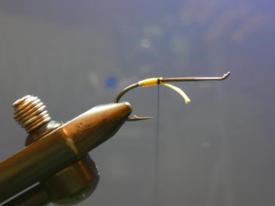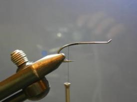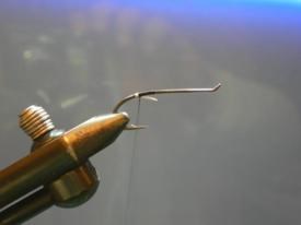Emmener le fil de montage à la courbure de l'hameçon, vis à vis l'ardillon.