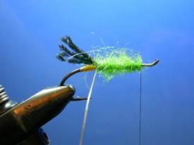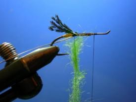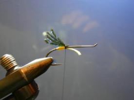 Attacher le tinsel devant servir à la fabrication des côtes, et préparer le dubbing de blanchon vert kelly (vert brillant dans le montage).