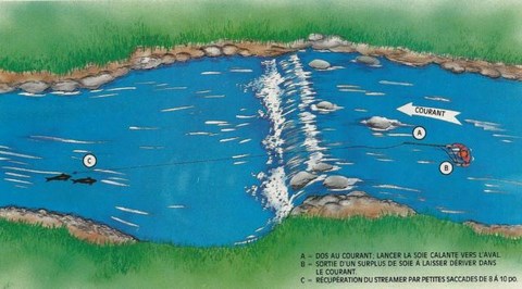 La technique alors préconisée pour provoquer ces dorés s'avère assez simple. Le pêcheur doit se poster en amont, dos au courant, et lancer son artificielle vers l'aval, dans le rapide, en laissant progressivement dériver un surplus de soie pour permettre à l'artificielle d'atteindre le fond de la fosse. Lorsque celle-ci en a rejoint le fond, ramenez votre soie par portions de 8 à 10 po. (20 à 25 cm). Votre mouche commencera alors à s'élever et passera au-dessus de la tête du doré qui la foudroiera au passage.