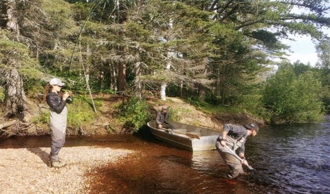 Après un copieux repas «de Reines» préparé par nos guides (normalement les clients amènent leurs lunchs), Mikael nous propose de faire quelques lancers là où le ruisseau «Petite saumon» se jette dans la rivière. Au deuxième lancer, un beau mâle s'accroche au streamer de Joannie, et s'ensuit d'un combat épique et de sauts acrobatiques. On passe une superbe journée! Mikael n'arrête pas de nous dire comment il aurait aimé que le niveau de la rivière soit «normal». Il explique que la pêche aurait été plus agréable à gué. Une chose est sûr, c'est que nous n'hésiterons pas d'y retourner avec un débit de rivière plus «normal» !