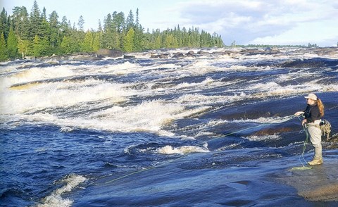 Après un sommeil récupérateur au Château Roberval, on se lève au crépuscule afin de rencontrer Rémi, notre guide pour l'avant-midi. Ce matin-là, on va pêcher la rivière Basse-Ashuapmushuan, qui est l'une des 4 rivières où remontent les ouananiches. On se rend à la fosse de la Chute à l'Ours où on pêche sur un immense cap de roche. La largeur de la rivière fait penser à celle d'un fleuve avec plusieurs contre-courants au pied d'une chute. C'est carrément un paysage à couper le souffle! Dès les premiers lancers, plusieurs ouananiches attaquent nos mouches! Il faut toutefois s'habituer à la rapidité et la puissance de ces poissons, ce qui demande une adaptation du ferrage et de la manipulation de la soie. Nos techniques de pêche ressemblent à une pêche aux saumons (45 degrés en aval du courant), mais on active la mouche en fin de dérive, en «strippant» et parfois même pendant la dérive.