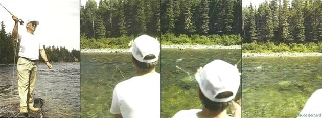 > 4) TENTATION : Le saumon s'élève tranquillement tourne vers l'aval observe, suit la mouche et la gobe en plongée à la moindre accélération. Le pêcheur doit avoir les nerfs solides !