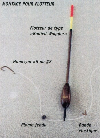 Les modèles les plus efficaces sont ceux de forme allongée en bois de balsa. Le montage est simple. Il suffit d'enfiler le flotteur sur le monobrin pour ensuite attacher un petit hameçon numéro 6 ou 8 au bout du monofilament. Une douzaine de pouces plus haut que l'hameçon, on ajoute un petit plomb fendu pour terminer le montage à l'aide d'un bout de bande élastique. Cette bande est ensuite attachée à la hauteur où l'on désire que le flotteur s'arrête et bloque l'appât (pro-fondeur de l'appât). La grosseur du petit plomb fendu dépend du poids de l'appât. Il peut arriver qu'à la première tentative, le flotteur demeure couché ou qu'il cale tout simplement. C'est à vous de diminuer ou de grossir le petit plomb jusqu'à ce que le flotteur se tienne droit et cale légèrement.