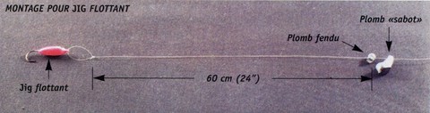 Le montage s'effectue de la façon suivante: on enfile le plomb sabot en premier sur le monofilament en s'assurant de le monter dans la bonne direction, c'est-à-dire le sabot vers l'appât, pour qu'il glisse librement sur le fond. Ensuite, on attache le jig flottant à L'aide d'un noeud à boucle pour qu'il flotte bien droit et on termine en attachant un petit plomb fendu à 24 pouces du jig flottant pour bien barrer l'ensemble.