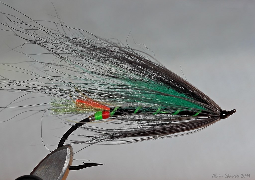 La veille de notre journée de pêche, j’avais attaché quelques mouches et j’ai fait cadeau d’une de celles-ci à un ami. Cette mouche lui a valu la capture de trois grands saumons sur le pied du Malin le mardi et un autre le lendemain, je l’ai baptisée la AC Dion Spéciale et je vous livre la recette ici-bas.