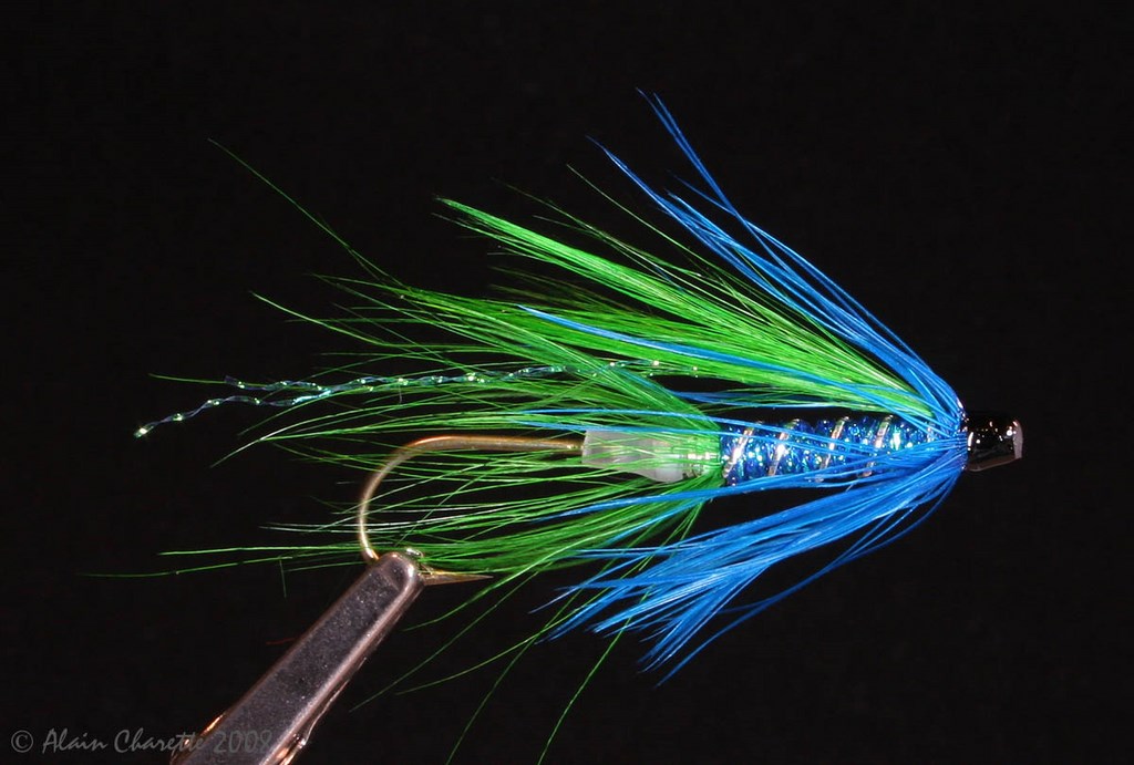 Aile: 2 brins Krystal flash bleu et fibres de Spey hackle vert