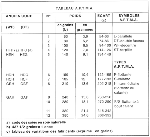 Les pesanteurs indiquées par les manufacturiers sur leurs cannes sont aujourd'hui conformes au tableau ci-contre. Le pêcheur peut maintenant choisir une soie sans difficulté et être assuré que la canne et la soie formeront la partie principale d'un ensemble balancé.