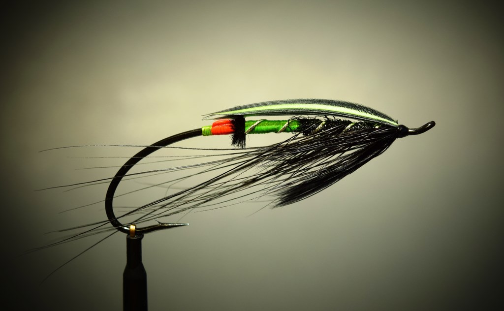 Corps : Fibre de plume d'autruche noir suivi de 1/2 floss hot green et 1/2 dubbing noir. Le spey hackle part de la 3iem côtes