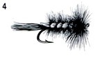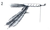 Une fois le corps bien en place, attachez-le solidement à la hampe en enroulant votre fil de montage en cinq ou six spires équidistantes, que vous cacherez ensuite à l'aide des hackles suspendus antérieurement: vous enroulez simultanément ces deux hackles autour du corps, à la mode Palmer, pour former les côtes. Devant le corps, vous formez une couronne en utilisant plusieurs hackles de selle de la même couleur que ceux employés pour faire les côtes et que vous enroulez très serrés derrière la tête.
